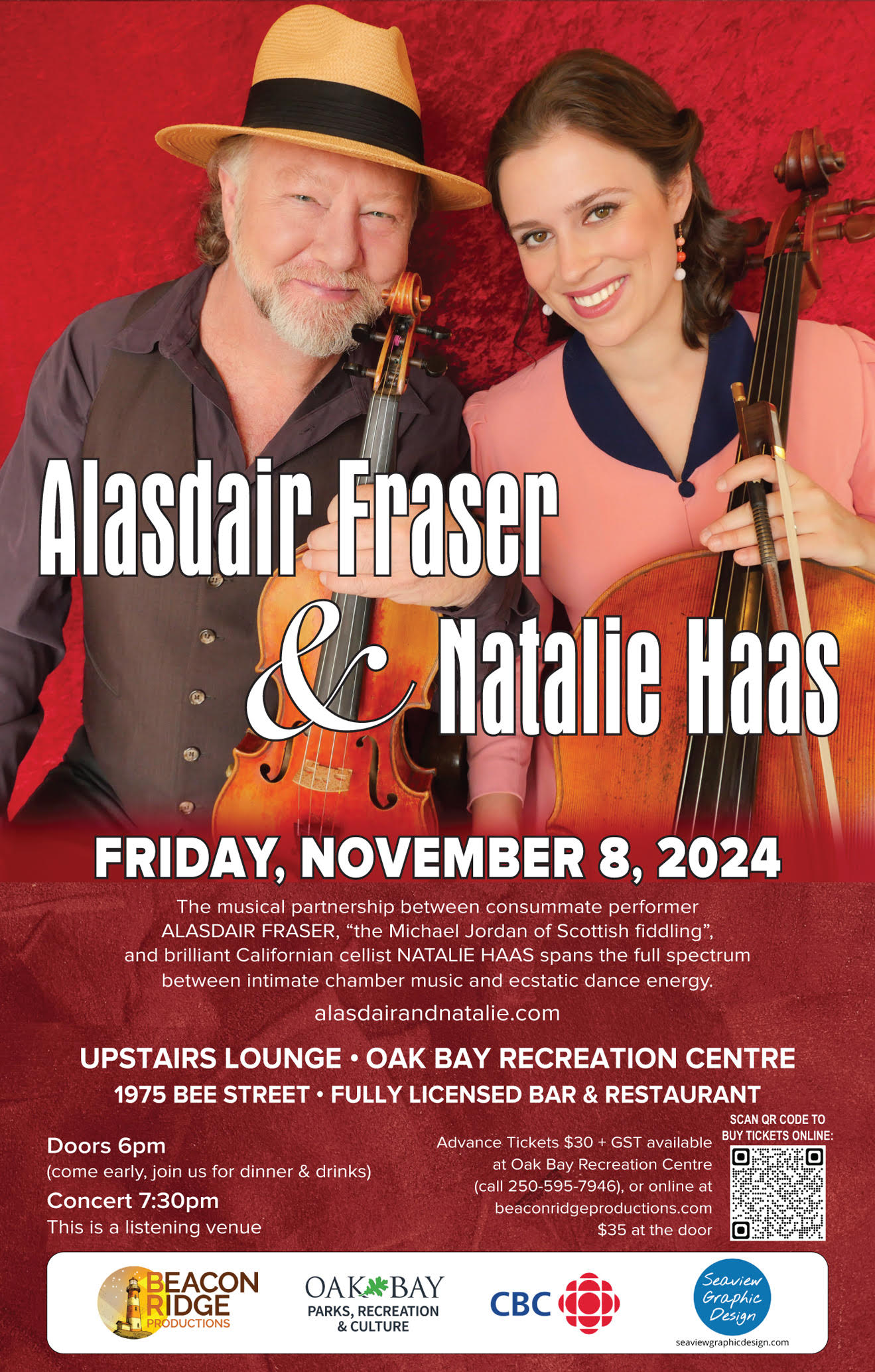 The musical partnership between consummate performer Alasdair Fraser, “the Michael Jordan of Scottish fiddling”, and brilliant Californian cellist Natalie Haas spans the full spectrum between intimate chamber music and ecstatic dance energy. Over the last 20 years of creating a buzz at festivals and concert halls across the world, they have truly set the standard for fiddle and cello in traditional music. They continue to thrill audiences internationally with their virtuosic playing, their near-telepathic understanding and the joyful spontaneity and sheer physical presence of their music.